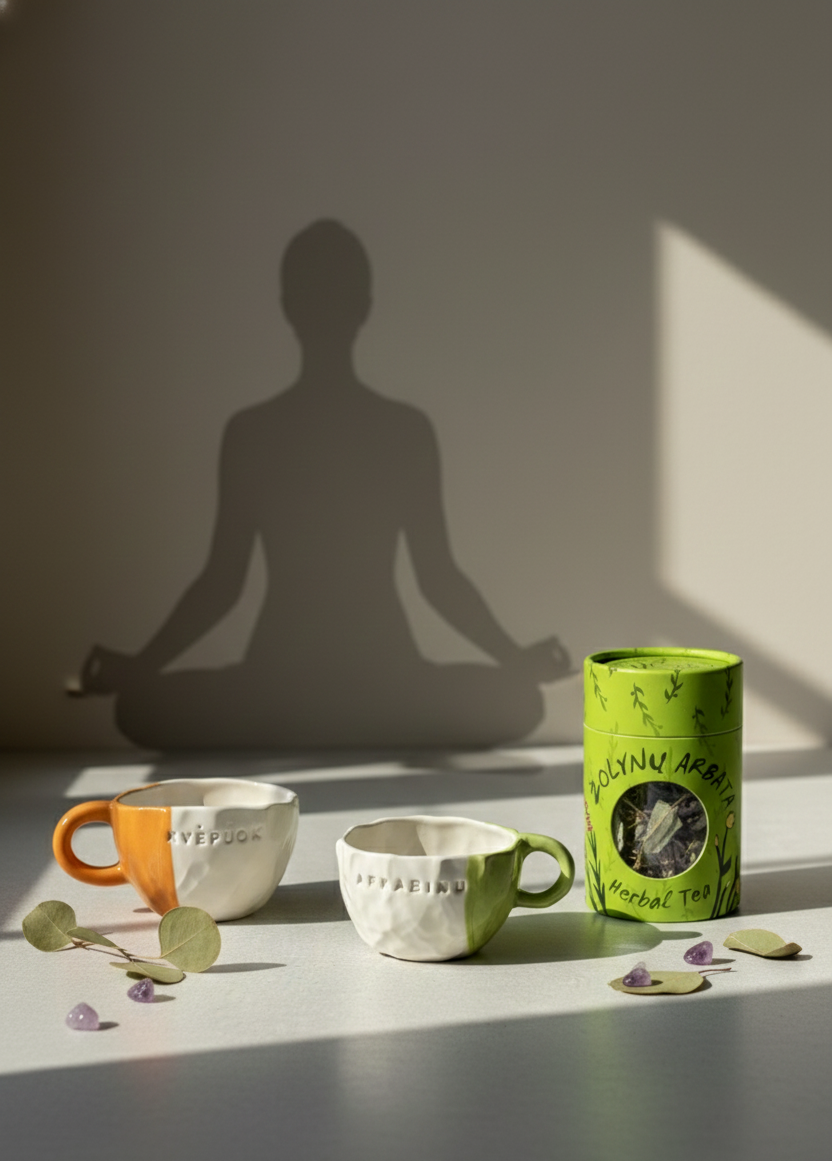 Ritualui sukurti reikalingas ne tik puodelis, bet ir skonis. Todėl rinkinyje rasite „Grus Grus“ arbatą iš Novaraiščio žolynų. Grus Grus arbatos pavadinimas susijęs su Novaraisčio aplinka – kur būriuojasi tūkstančiai gervių. Lotyniškai gervė – Grus Grus. Tai 100 % Lietuvoje rinktų žolelių arbata, kuri: